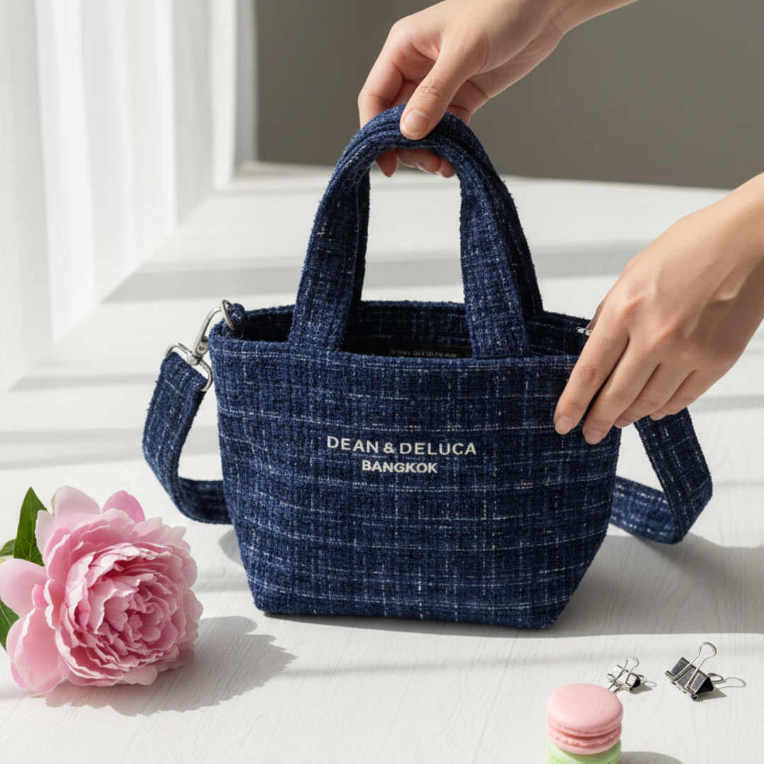 รายละเอียด: ด้านหน้าปักโลโก้ "DEAN & DELUCA BANGKOK" ด้วยด้ายสีขาวเด่นชัด ตัดกับสีเข้มของตัวกระเป๋า