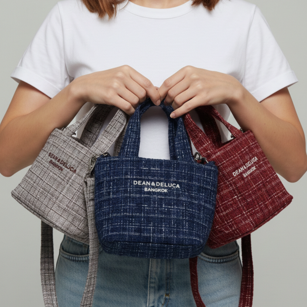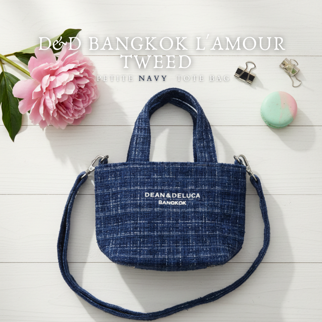 รายละเอียด: ด้านหน้าปักโลโก้ "DEAN & DELUCA BANGKOK" ด้วยด้ายสีขาวเด่นชัด ตัดกับสีเข้มของตัวกระเป๋า