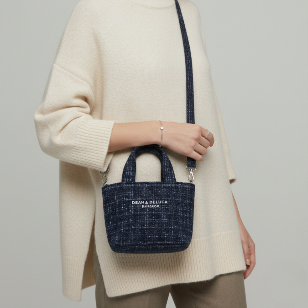 วัสดุและดีไซน์: ตัวกระเป๋าตัดเย็บด้วย ผ้าทวีด (Tweed) สีน้ำเงินเข้ม (Navy Blue) สลับด้วยด้ายสีขาวและสีเงินเล็กน้อย ทำให้เนื้อผ้าดูมีมิติ สุภาพแต่แฝงความหรูหรา